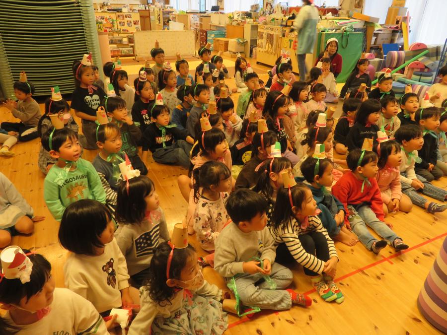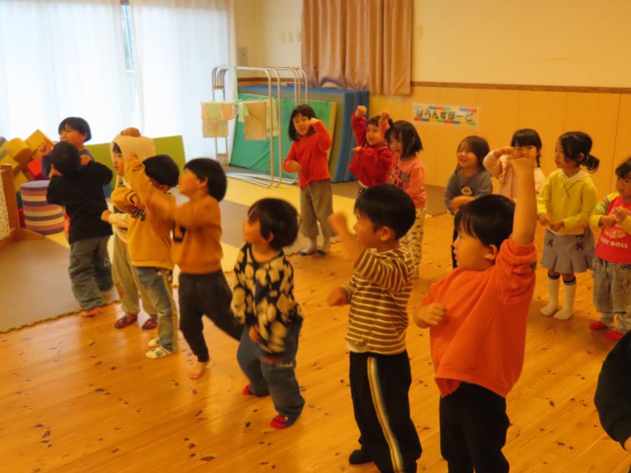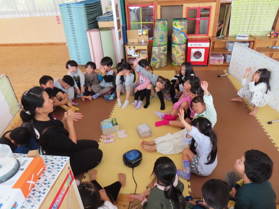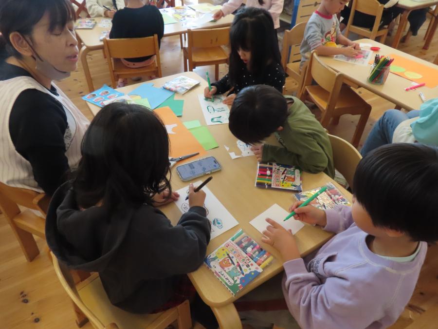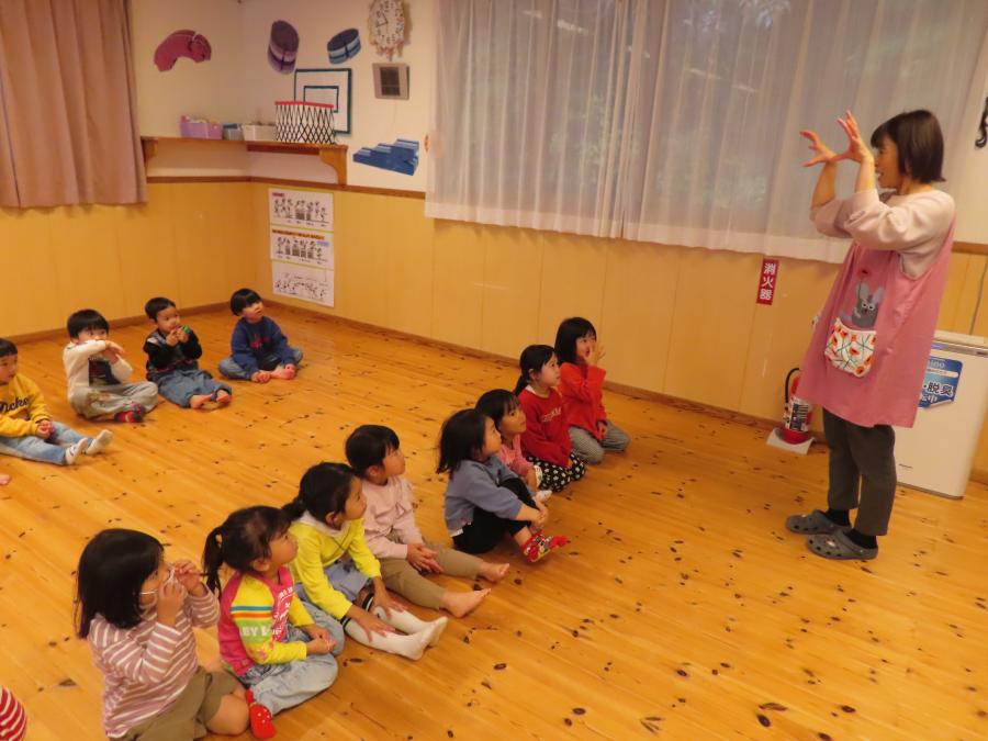 お集まりでも、うめ、もも、さくらさんに勤労感謝の話しをし、「例えば身近にいるお父さんやお母さんおじいちゃんやおばあちゃんも、たくさんお仕事頑張ってくれているよね!だから、いつもありがとうと感謝の気持ちを伝えられたらいいね」などの話しをしました。もしかしたら、お家で「ありがとう」と言ってくれたお友だちもいるのではないでしょうか?