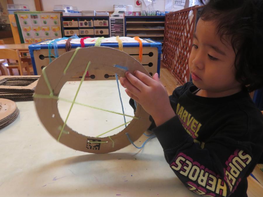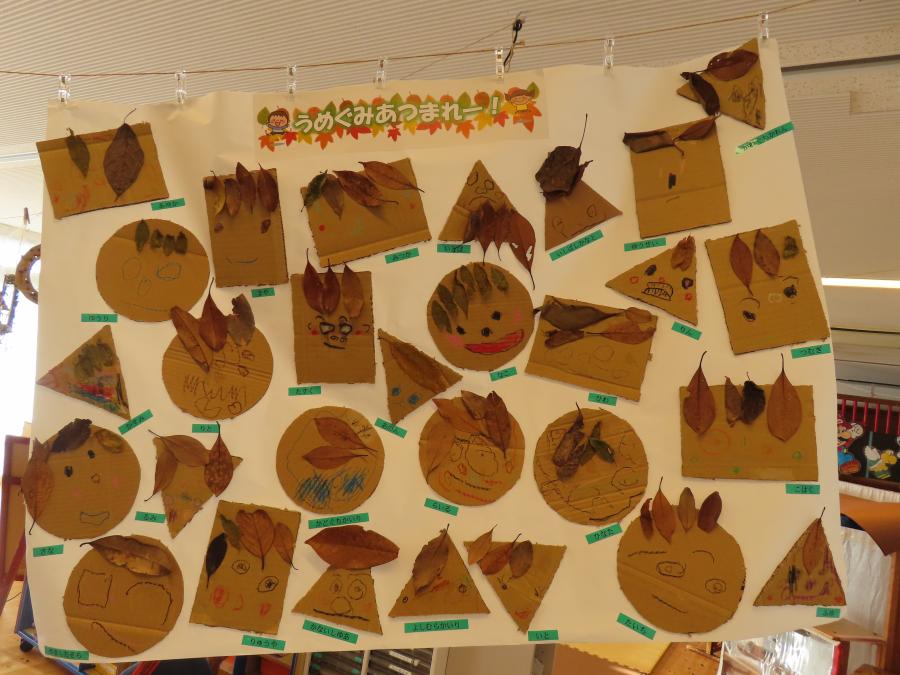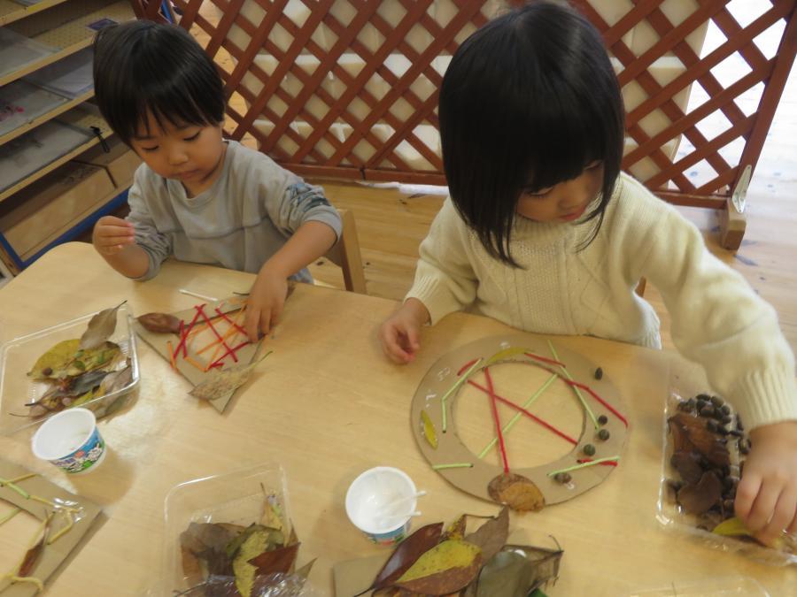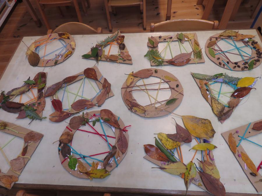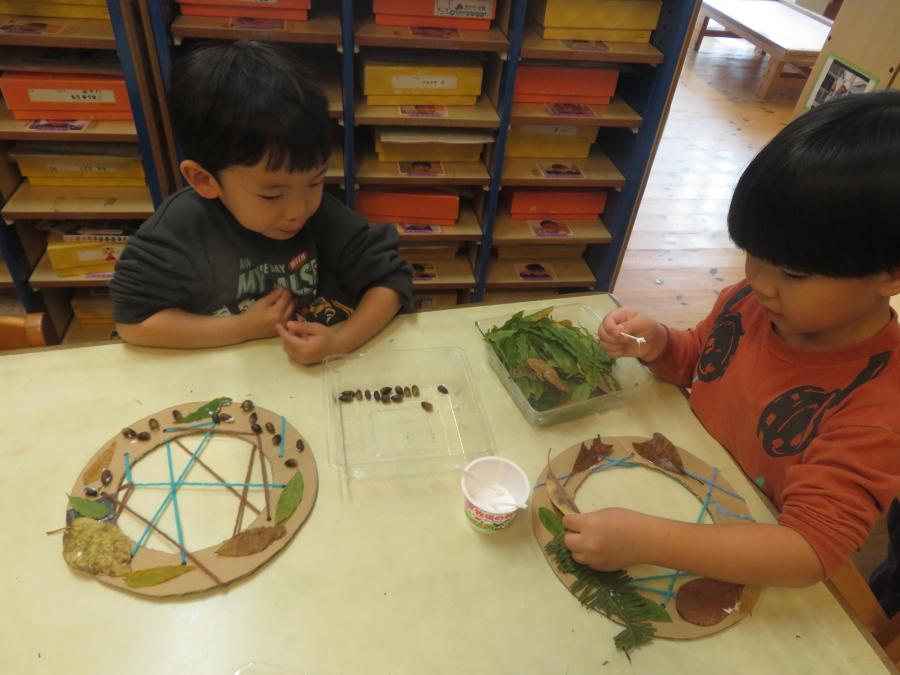 拾ったはっぱ木の実で、○△□の形のリースをつくりましたよ![]()