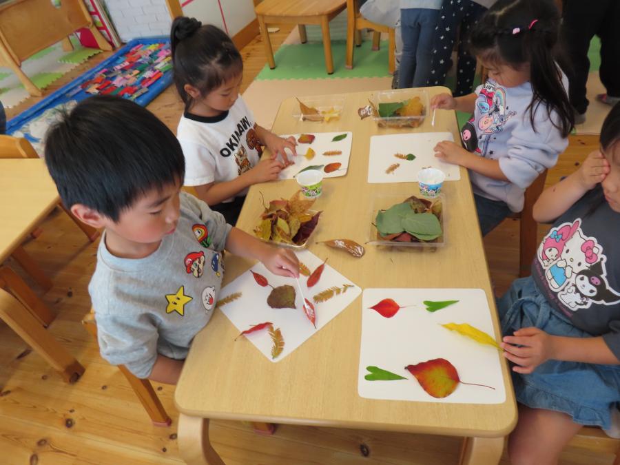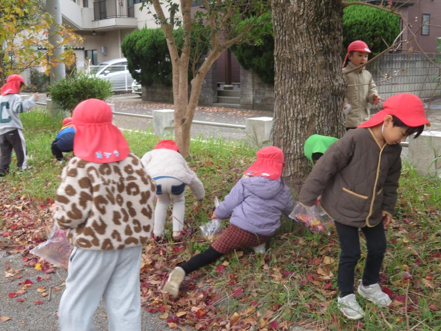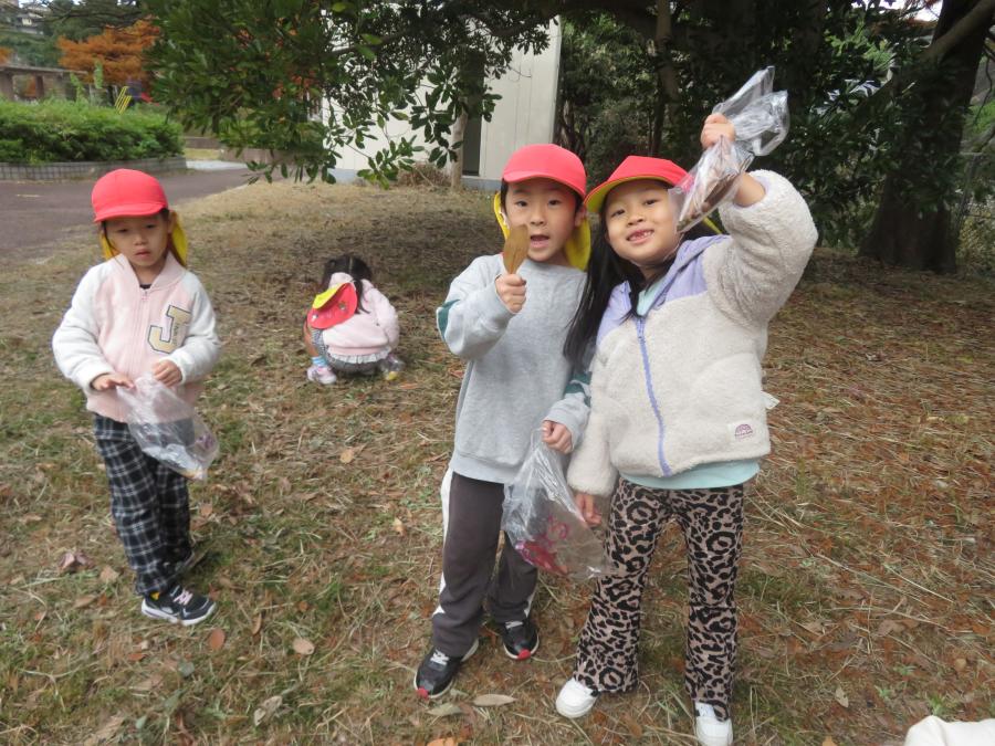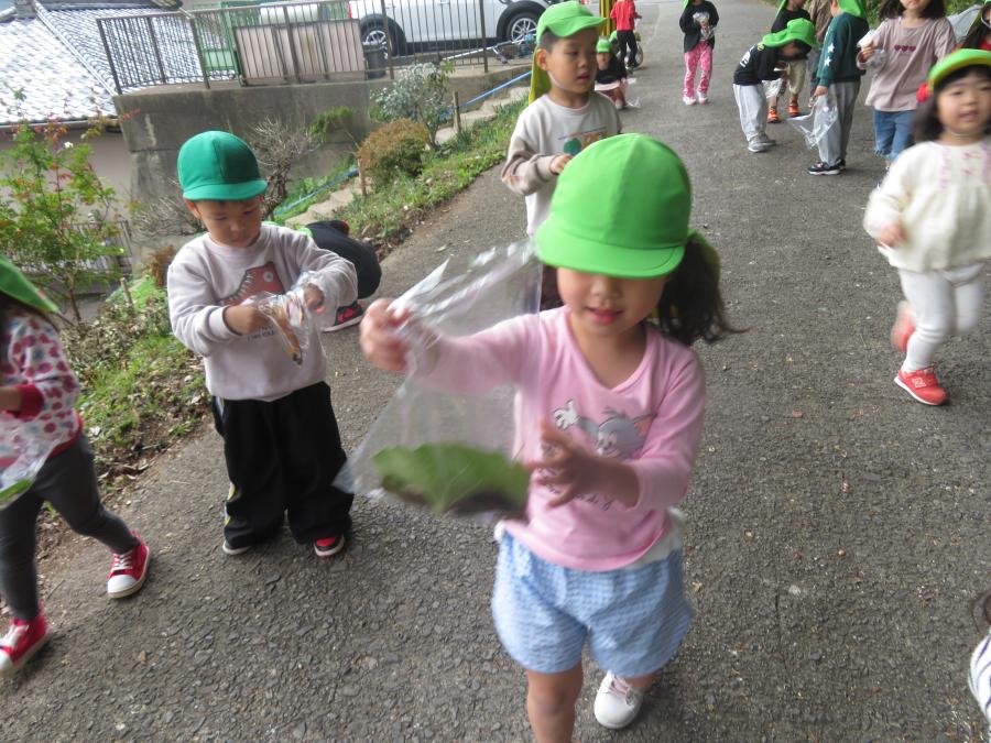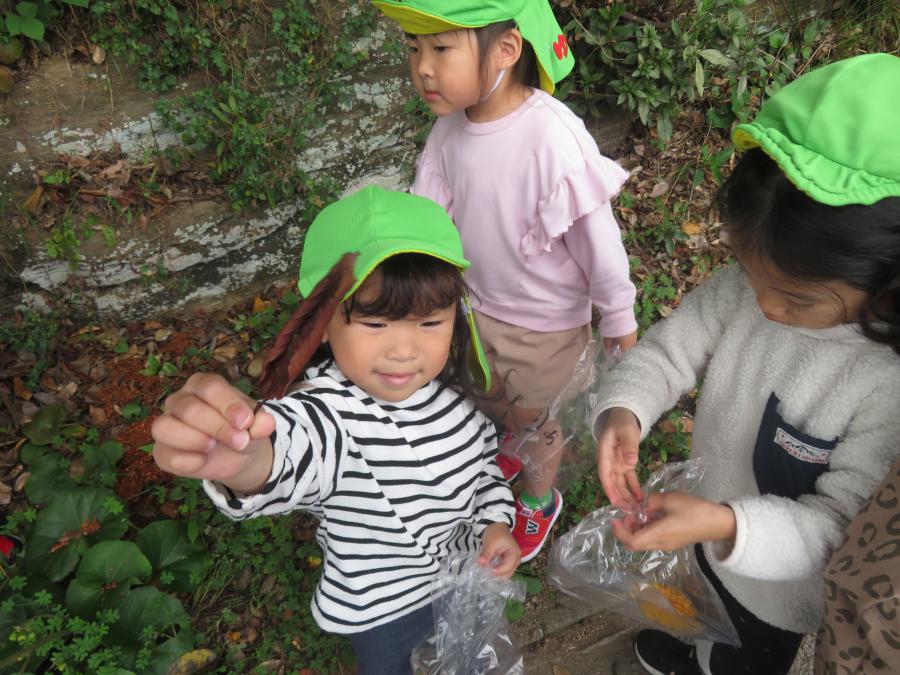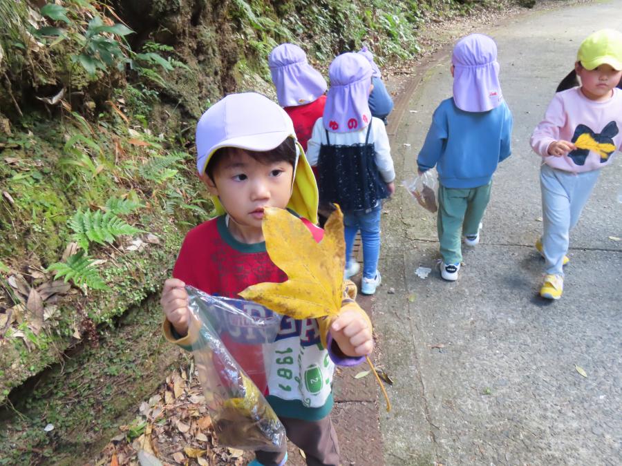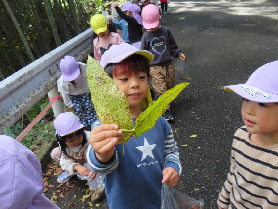 園周辺へのおさんぽでたくさん葉っぱや木の実を見つけました![]()