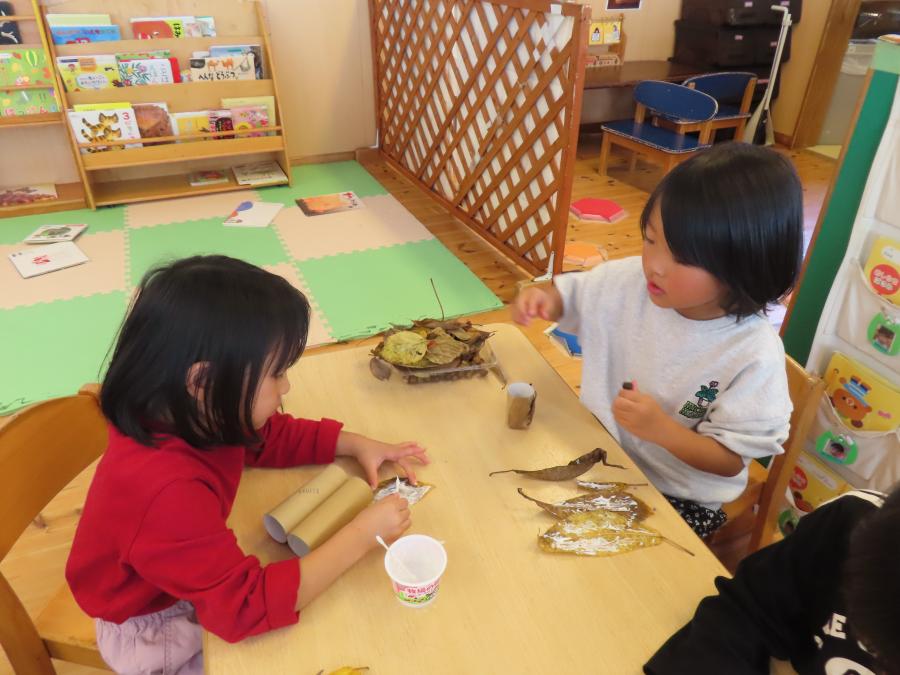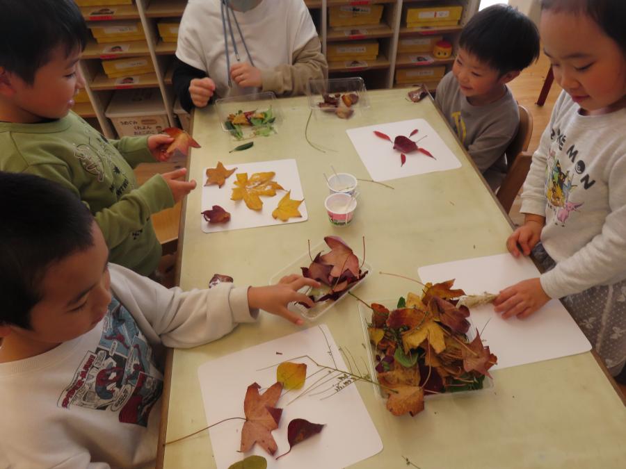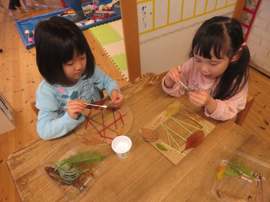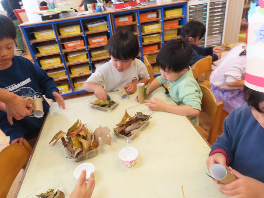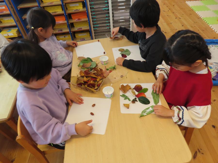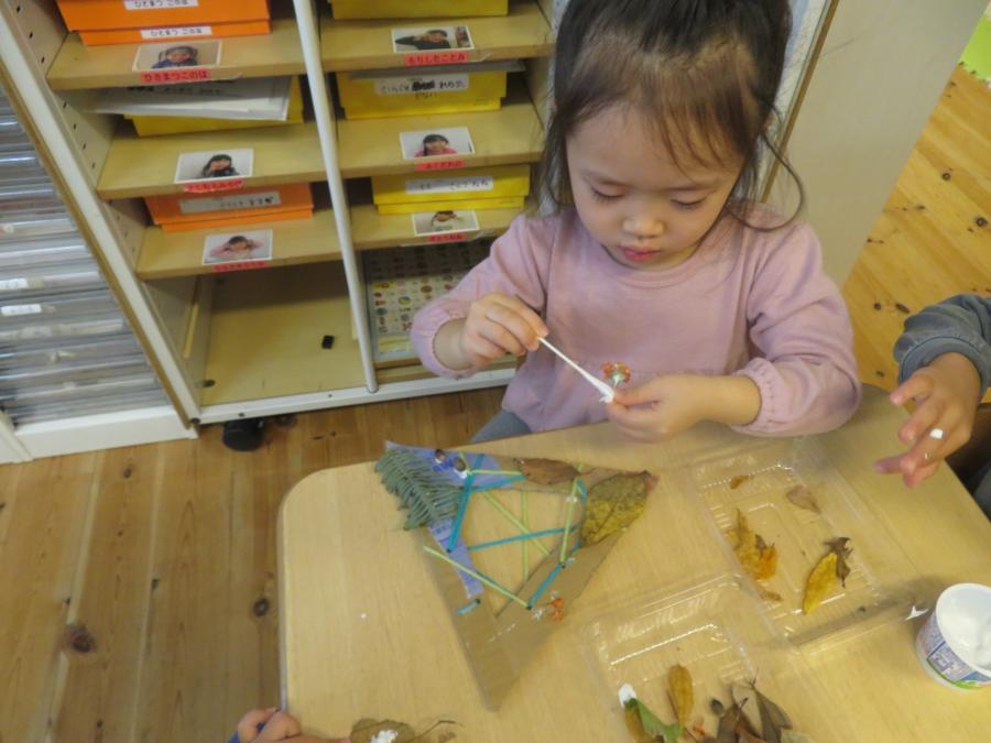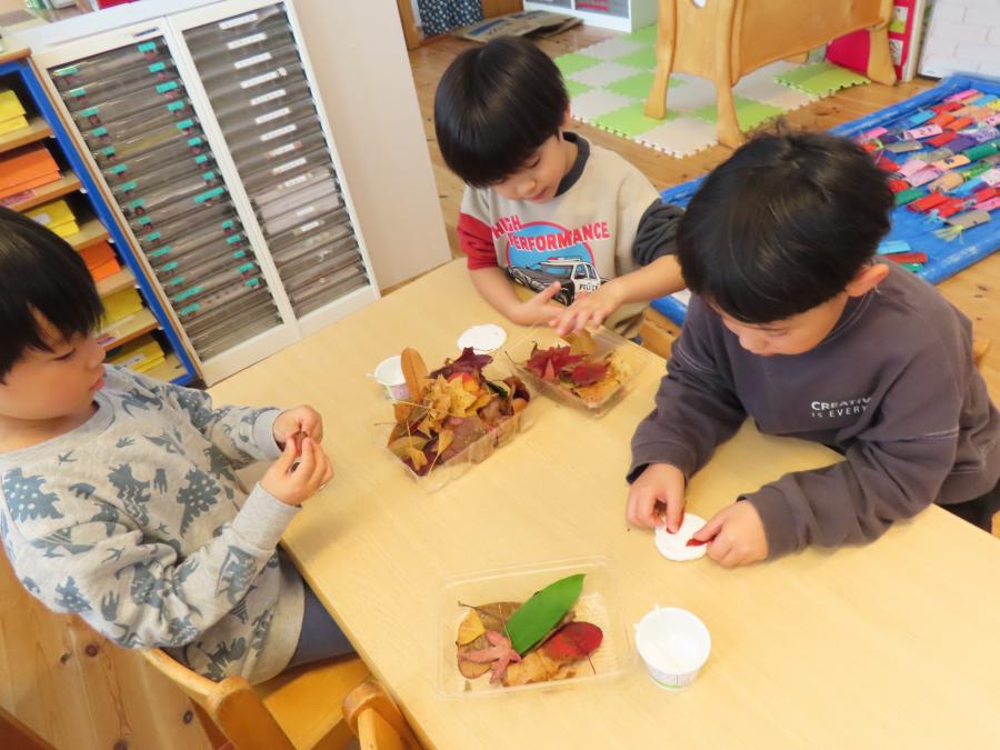 「1つの葉っぱでつくる」「どんぐり3個つかった」などかずを数えながら取り組んでました