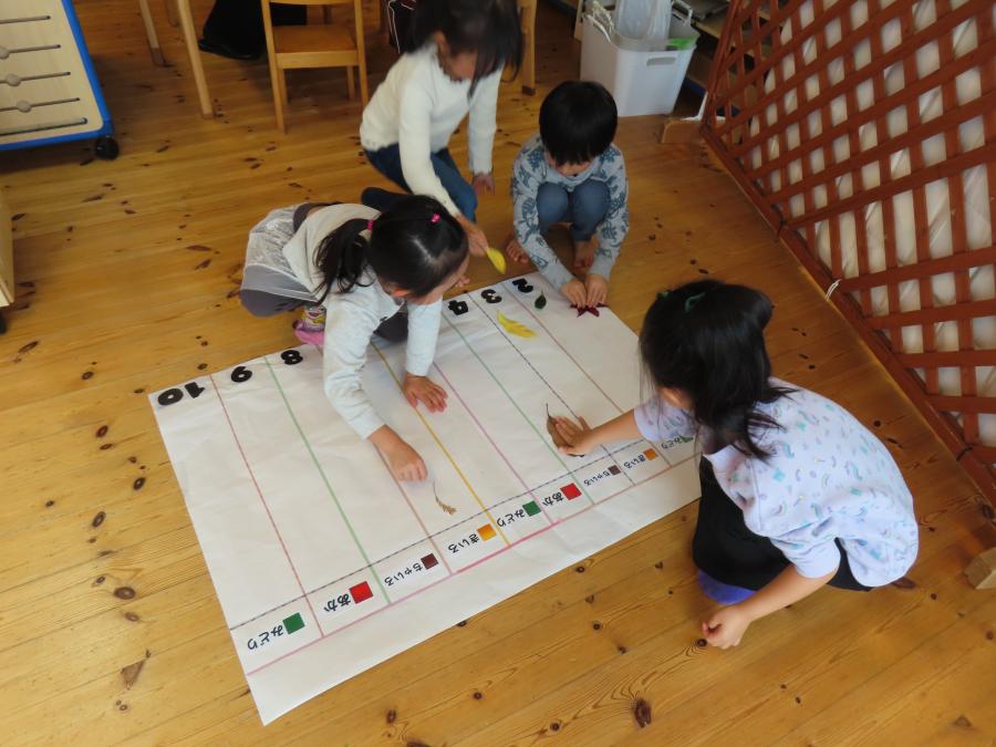 色ばかりに気を取られ、数が合わなくなったりしましたが、「ここすくないよ」や「ここはりすぎー」など自分たちで数えながら、また教えあいながら表が完成しました