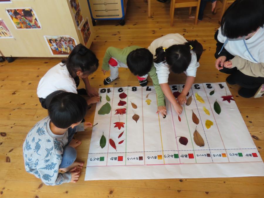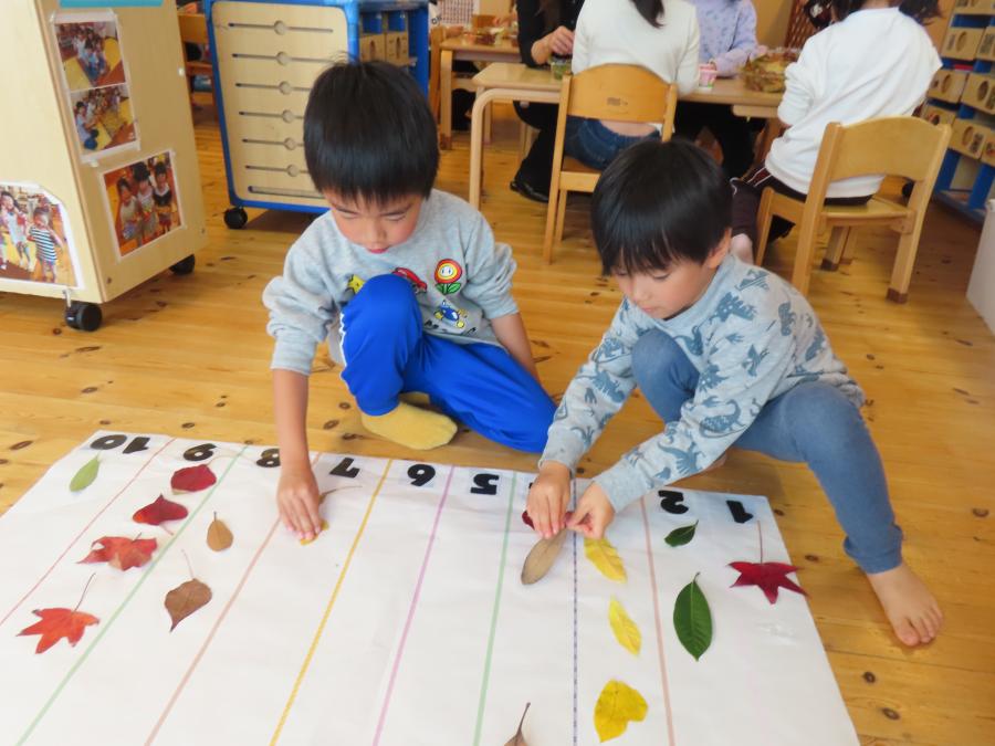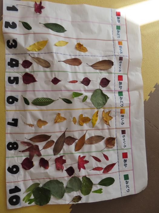 大きさがまぎらわしい葉っぱに「これはちゅうくらい?ちいさい?」と悩み悩みがんばってましたよ![]()