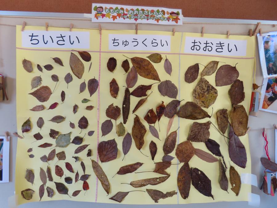 ももさんは、園から万来まで歩きながら、おおきいはっぱ、ちゅうくらいのはっぱ、ちいさいはっぱを考えながら拾いました。