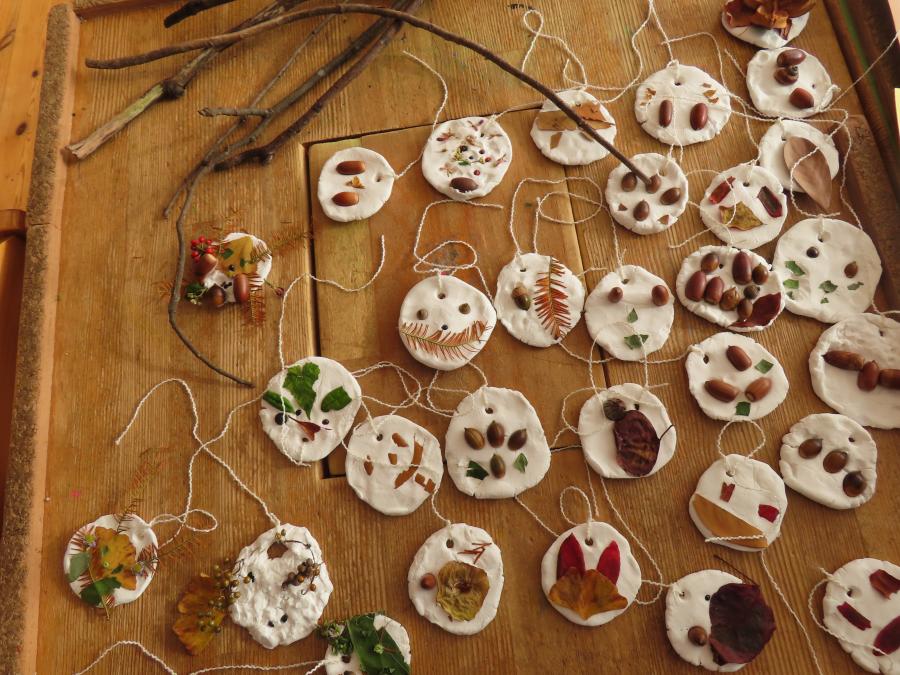 また、数を意識しながら、紙粘土に葉っぱや木の実を使っての作品も作りました![]()