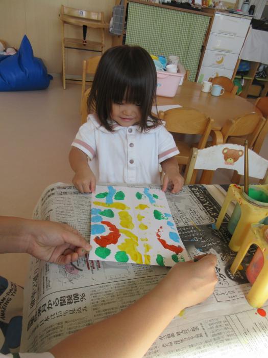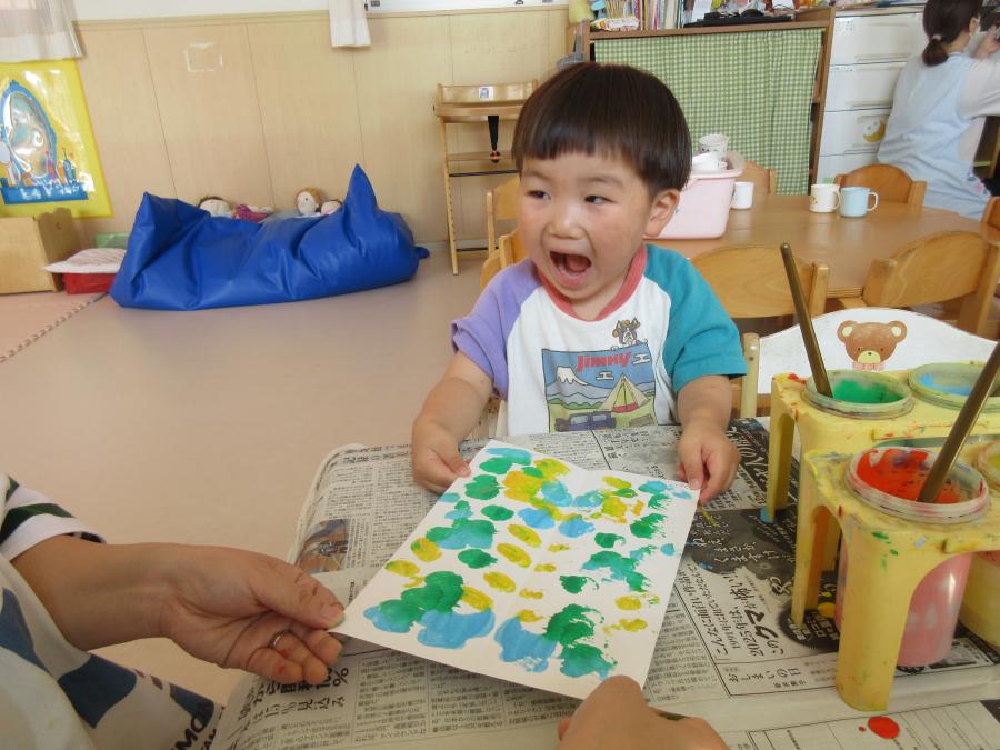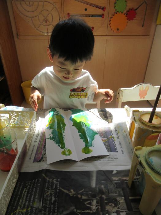 偶然できる模様の面白さを感じたり、自由に絵の具で表現する楽しさを味わったり、