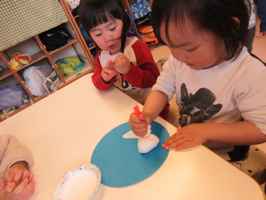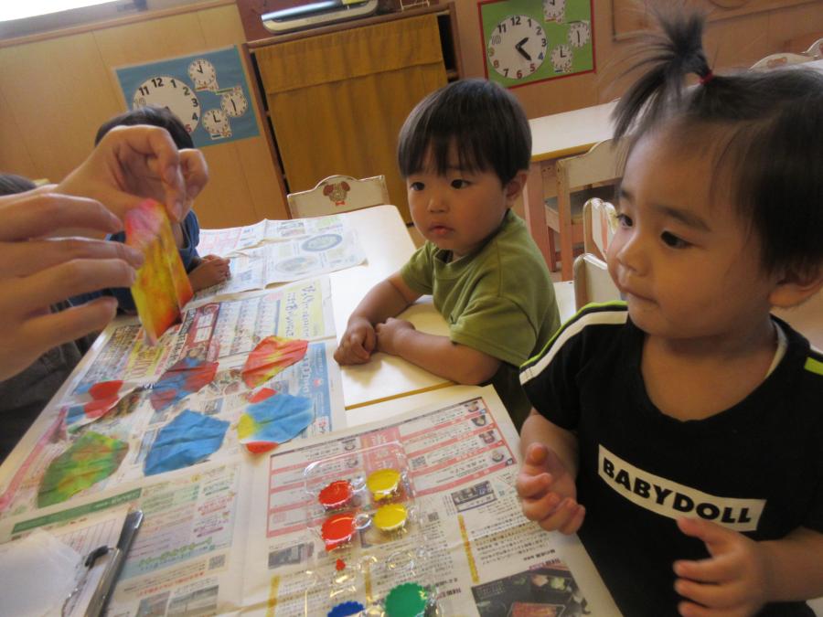 絵の具をつける。画用紙を折り合わせて全体をこすり、ゆっくり開くと・・・