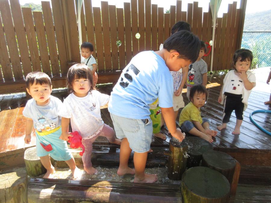 押すのも乗るのも大人気です グランドではかくれんぼ