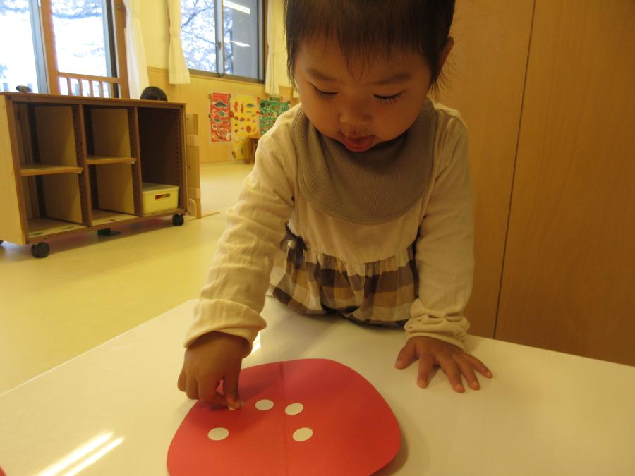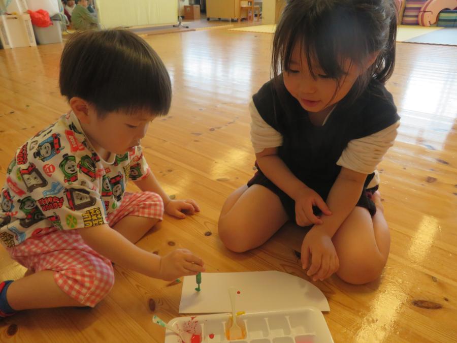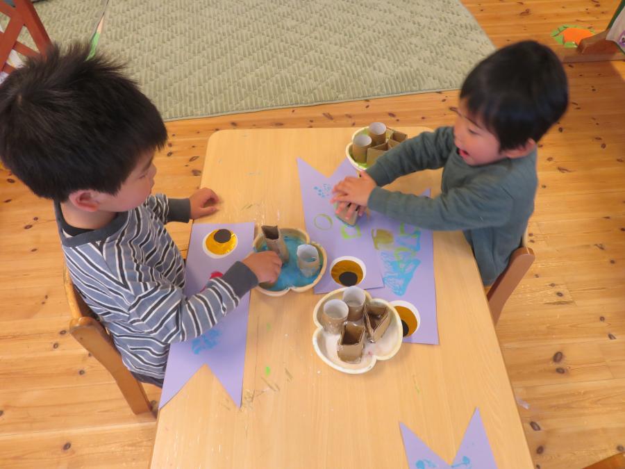 画用紙を半分に折り、片面に絵の具を塗ったり、スタンプのようにポンポンと