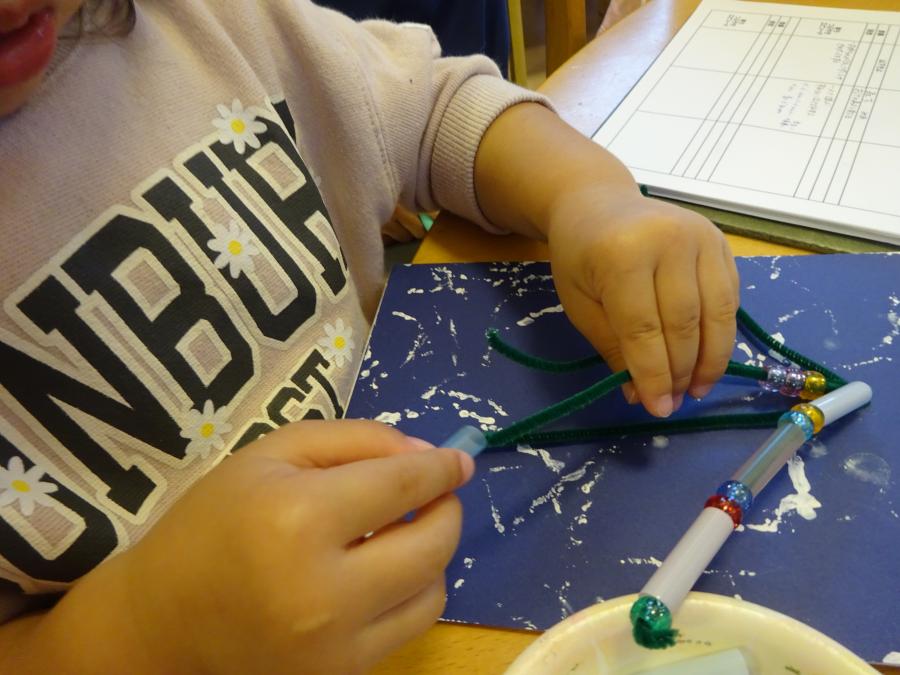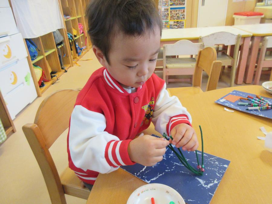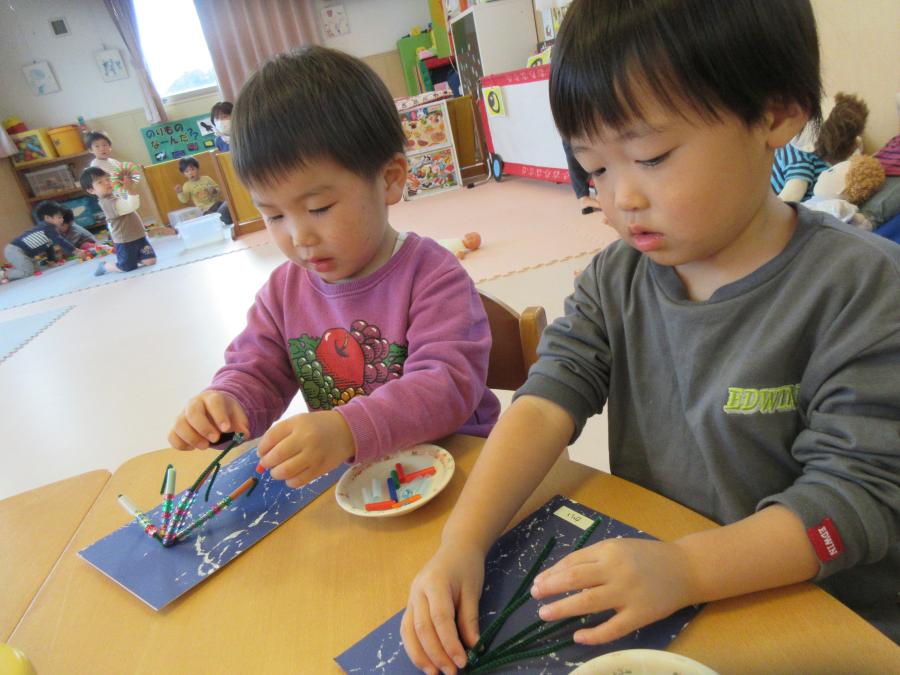 「1つの葉っぱでつくる」「どんぐり3個つかった」などかずを数えながら取り組んでました