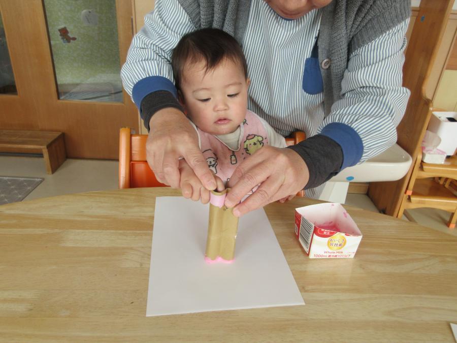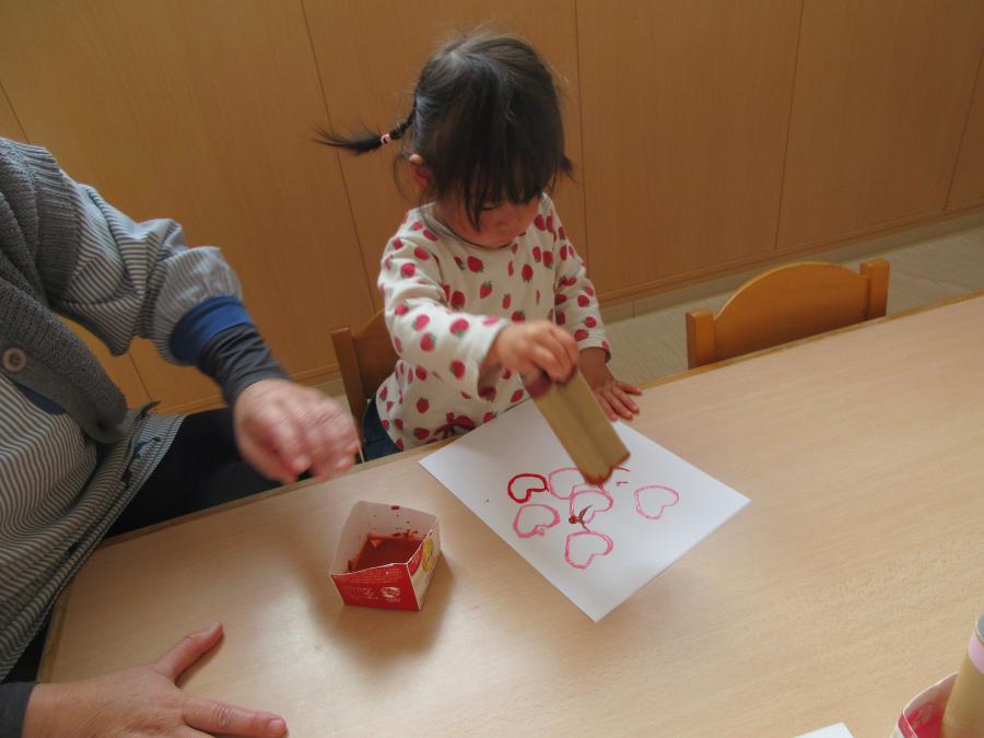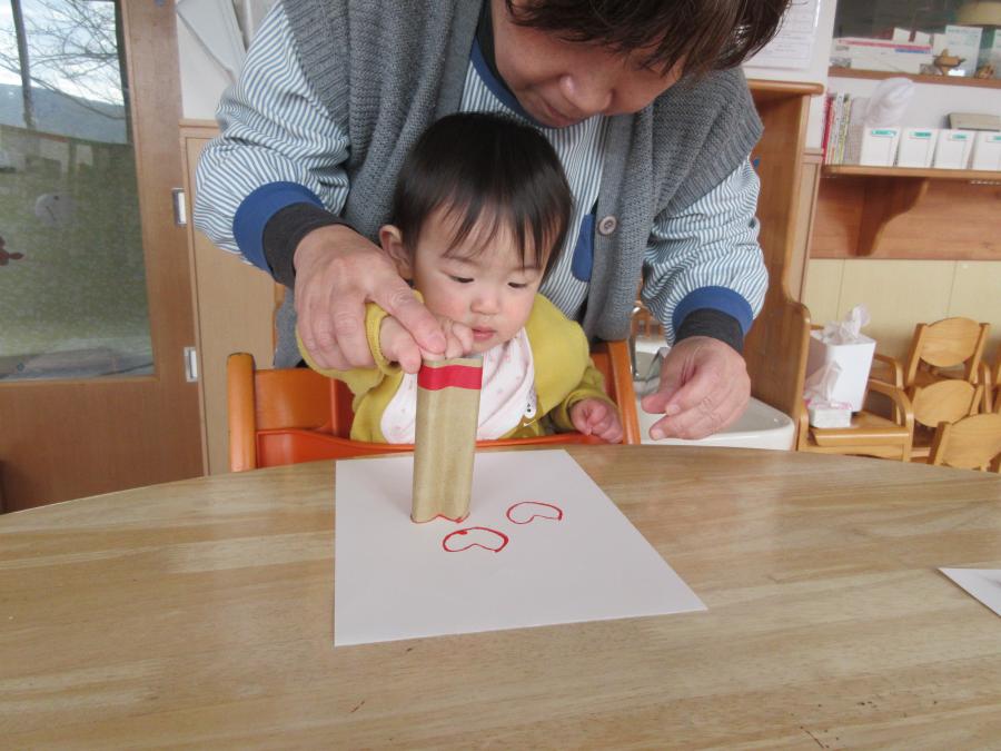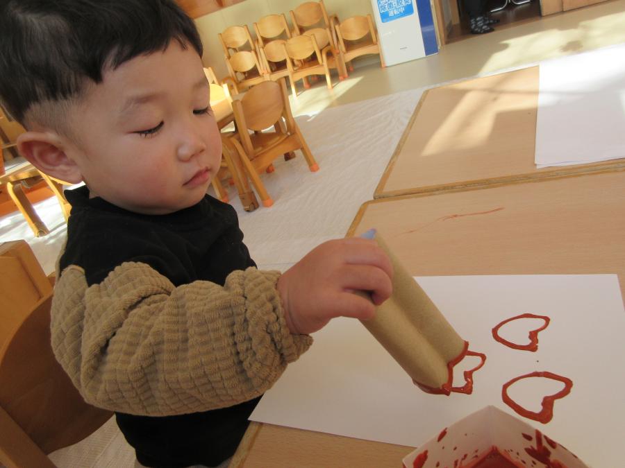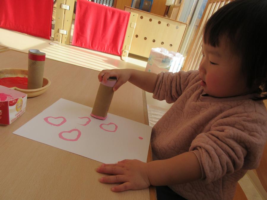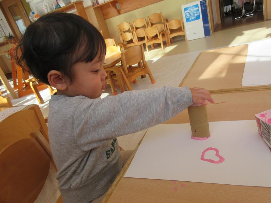 トイレットペーパーの芯をハート型し、スタンプをして作りました