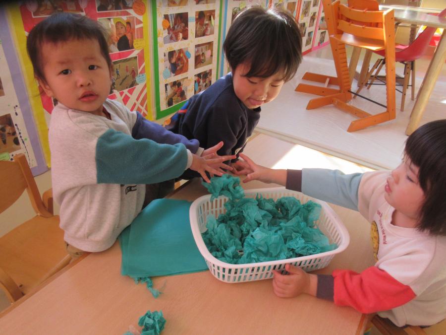 4つの色のチームに分かれてお花紙を丸めます