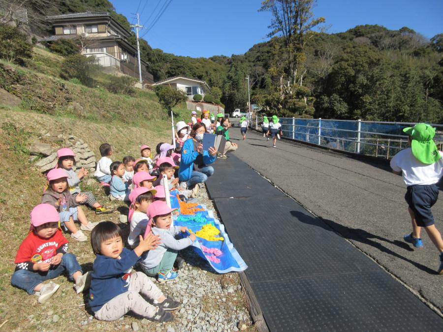 ひまわり組さんやゴールで待ってくれていた以上児のお兄さんお姉さんが「がんばれ!!」とエールをくれて